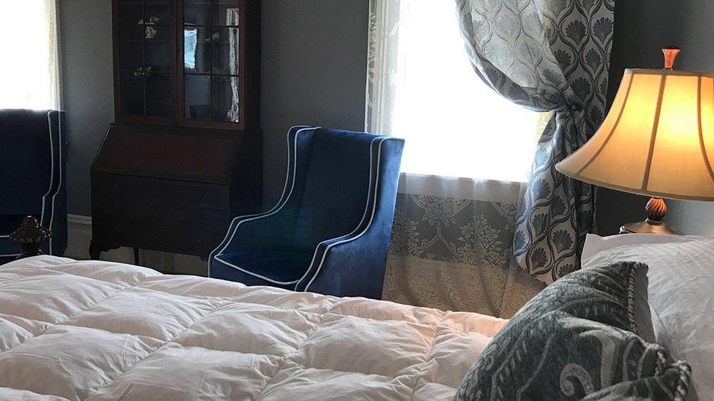 Located up on the mansion’s second floor, the Thomas Stanton Suite is one of our most spacious rooms, featuring a King-sized bed with antique door headboard.