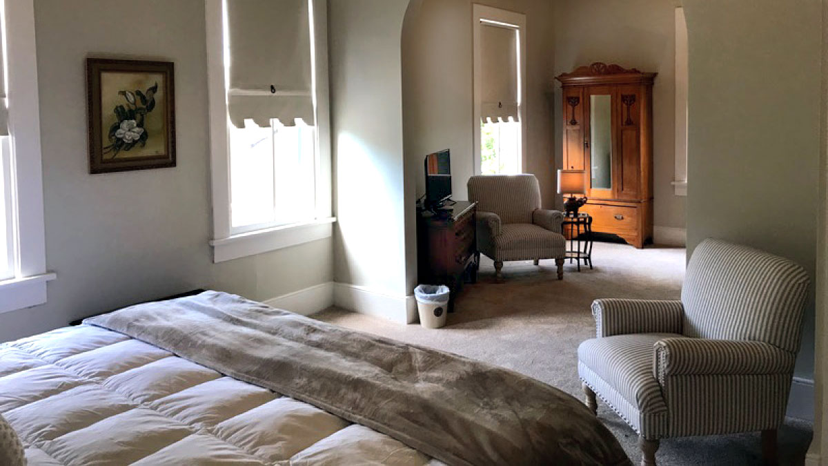 Located up on the mansion’s second floor, the Thomas Stanton Suite is one of our most spacious rooms, featuring a King-sized bed with antique door headboard.
